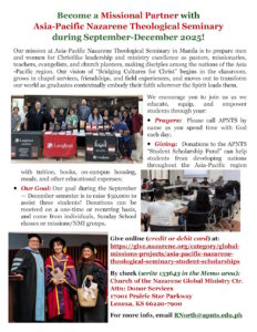 October began, for Cindy and I in the US, where I completed a seven-campus tour of all Nazarene sister Universities to promote the Asia Pacific Nazarene Theological Seminary’s (APNTS) Study Abroad program. The desire of APNTS is to host 10 students a term who would come and study on the APNTS Manila Campus in person. … Read more
